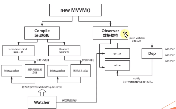 - 通过 Watcher 观察数据的变化,然后重新编译模板,渲染到视图上