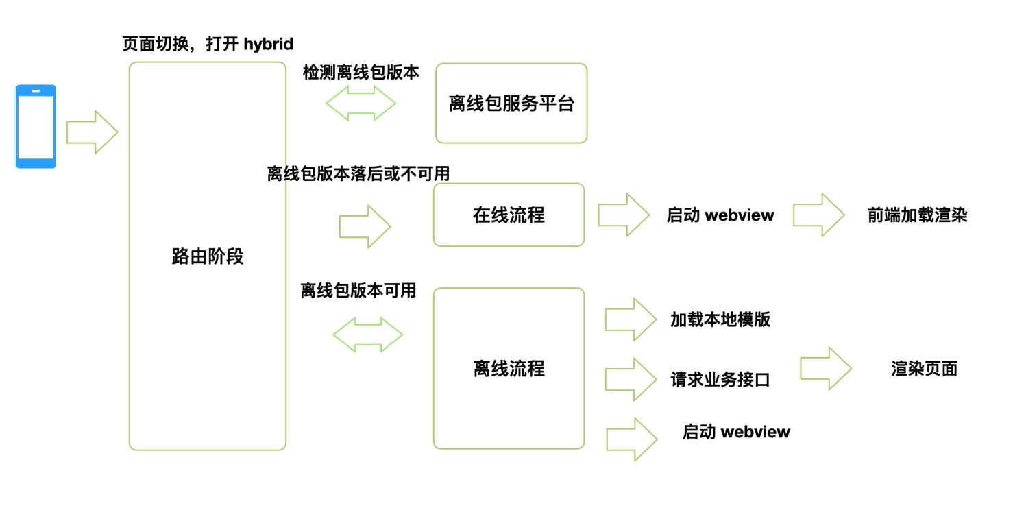 - 客户端提前下载HTML模板,用户交互时,由客户端完成数据请求并渲染HTML,交给WebView容器加载