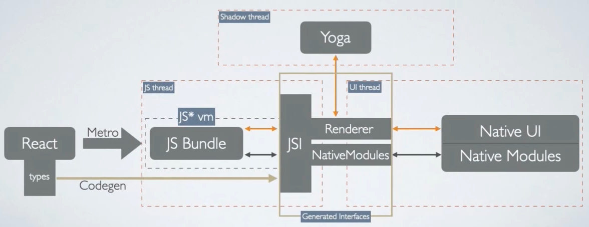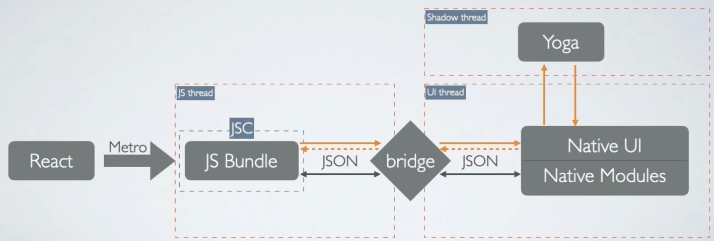 - Shadow线程:负责计算布局,React Native 通过 Yoga 布局引擎来解析并计算 FlexBox 布局,然后将结果返回原生UI线程。