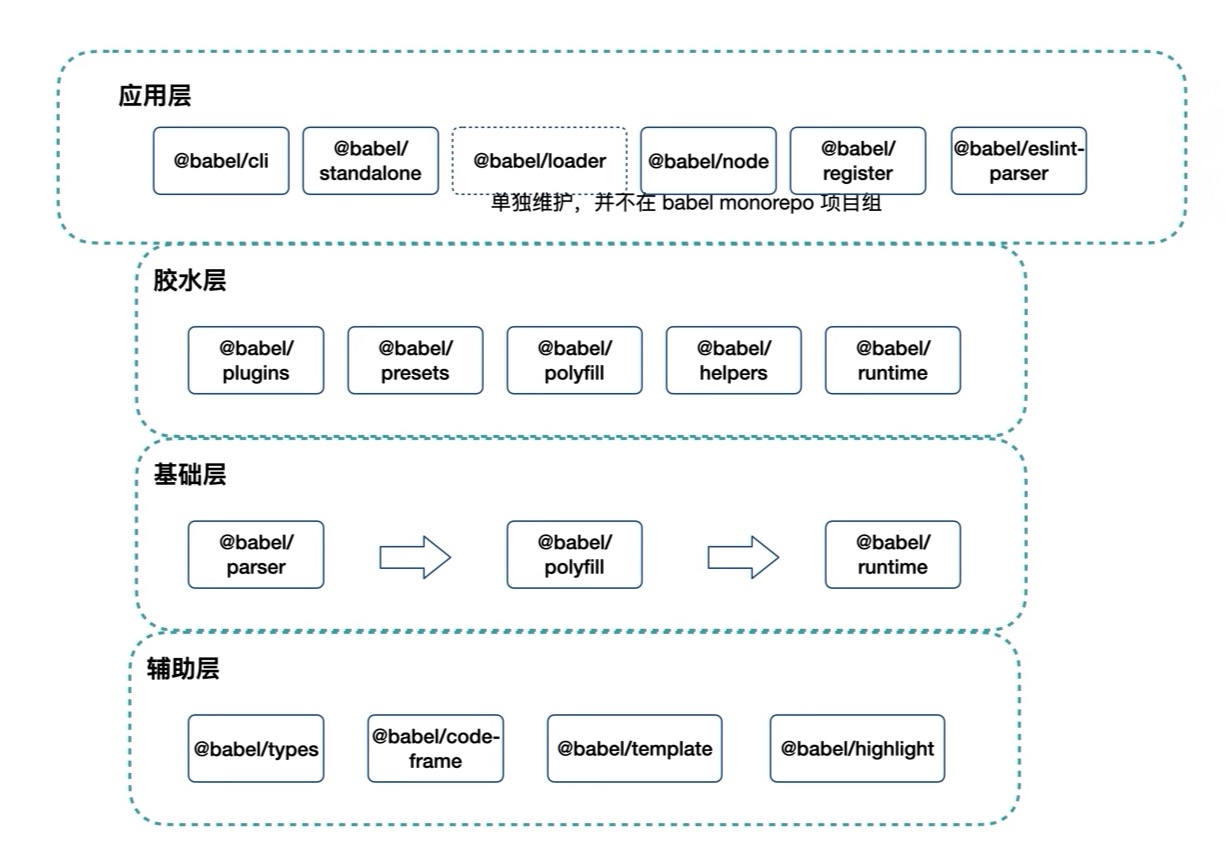 @babel/plugin是Babel插件集合 @babel/plugin-syntax-*是Babel语法插件,作用是扩展 @babel/parser的能力,比如@babel/plugin-syntax-top-level-await插件等@babel/plugin-proposal-*用于编译转换在提议阶段的语言特性@babel/plugin-transform-*是Babel的转换插件,