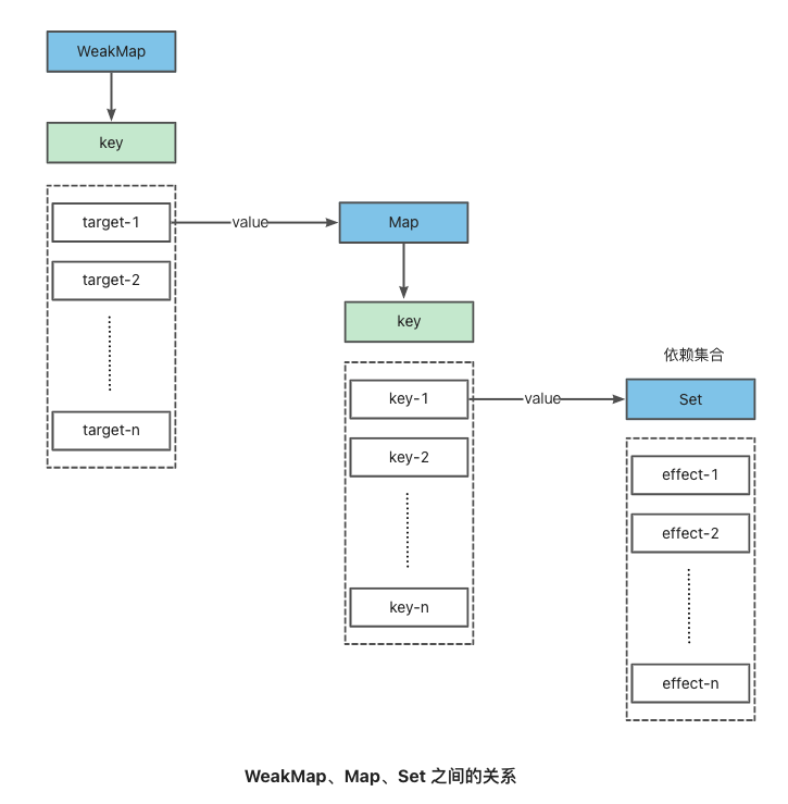 - 代码实现:使用 WeakMap 代替桶,用 Map 来存储 key,用 Set 来存储副作用函数effectFn。