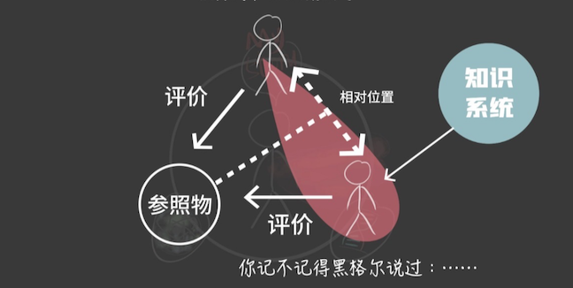 - 语言学家戴维森: 评价是一种精神世界的「三角测量法」 ;本质是通过语言,把我和你之外的某个对象设定为参照物,以此来确定各自的位置和立场,明确相对关系。