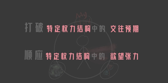 - 「打破预期,顺应张力」:即打破了特定权力结构下的交往预期,又要顺应了特定权力结构制造的欲望张力。