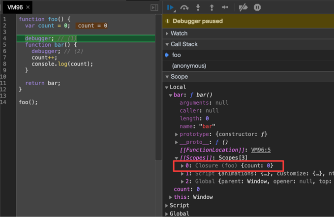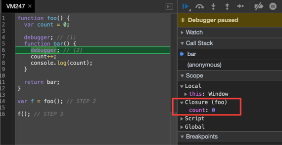 foo()早就执行结束了,但是foo()执行上下文环境还存在与栈中,因此bar()时,count可以查找到。